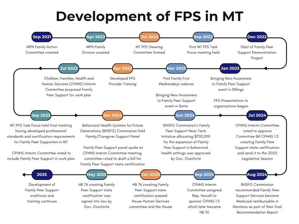 FPH was created to build upon the work started by Montana’s Peer Network (MPN). MPN has been supporting parents and caregivers raising children with behavioral health challenges and/or special healthcare needs since 2021 through advocacy, workforce development, education and direct services. They then created a Families Division in 2022 to further these efforts. In the last 4 years MPN has successfully formed and facilitated the MT Family Peer Support Task Force which developed professional standards for Family Peer Support Workforce, ran a Family Peer Support Pilot Project which provided state-wide Family Peer Support services and collected data that was used by Montana’s Governor in 2024 to allocate funding to Family Peer Support programs. They created a statewide family membership which provides community, connections and support to parents and caregivers. They also worked with legislators on HB76 to create state certification for Family Peer Support which was signed into law in May 2025.